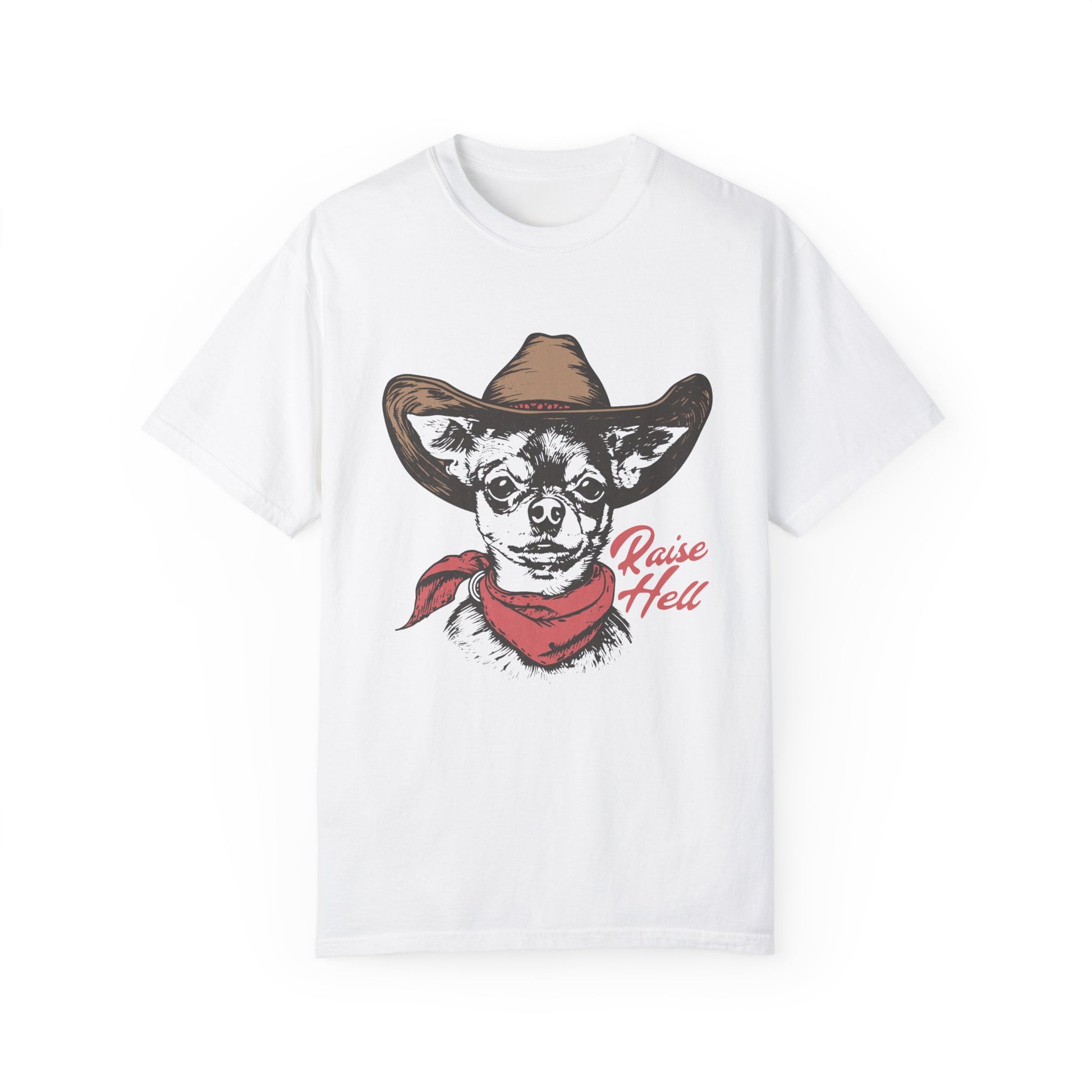 Channel your inner rebel with our "Raise Hell Chihuahua" T-shirt, designed for those who embrace both their love for their feisty furry friend and a bit of cowboy flair. This funny tee is perfect for any Chihuahua mom or dog lover who appreciates a sassy touch to their wardrobe. Whether you're out and about or lounging at home, this shirt adds a playful edge to your style.