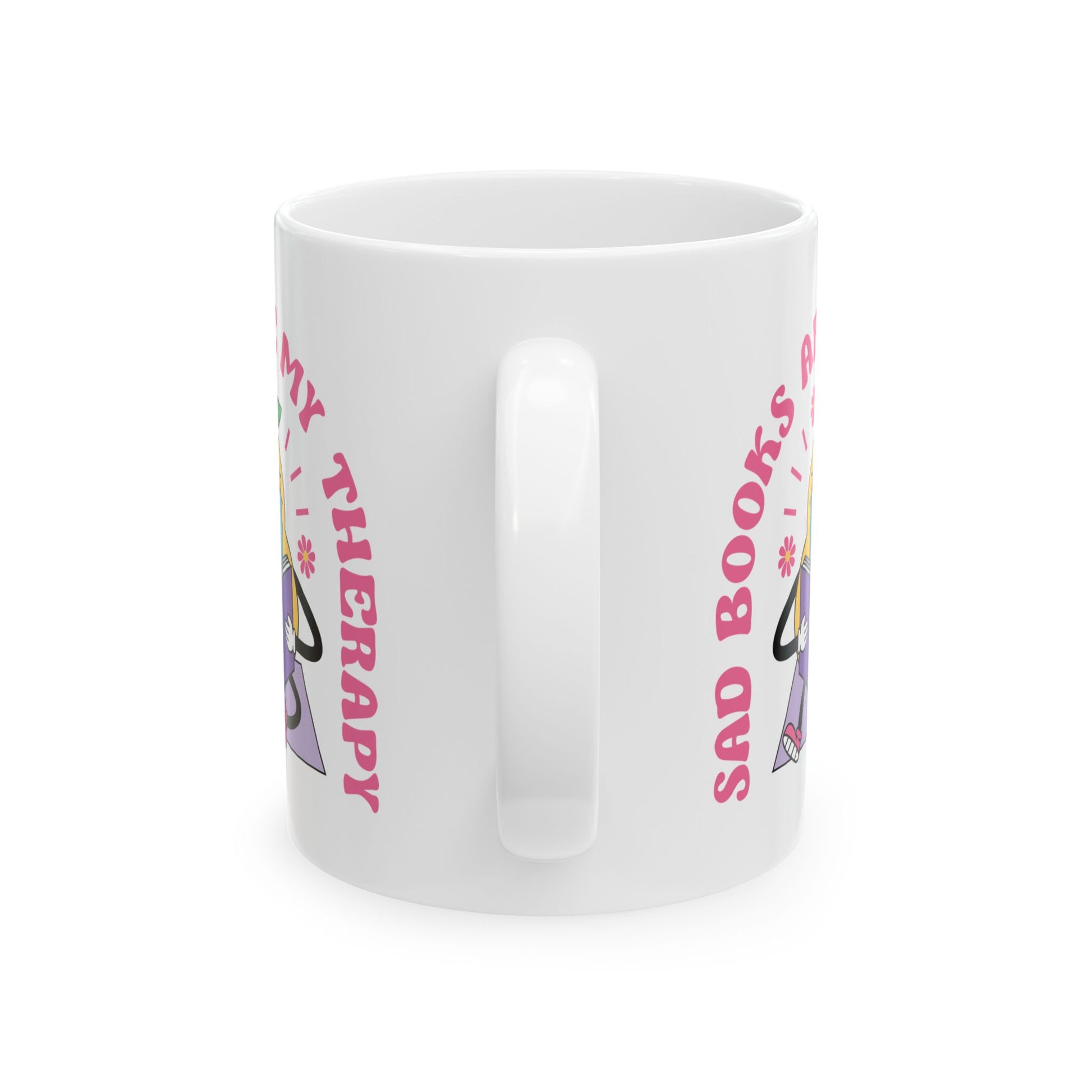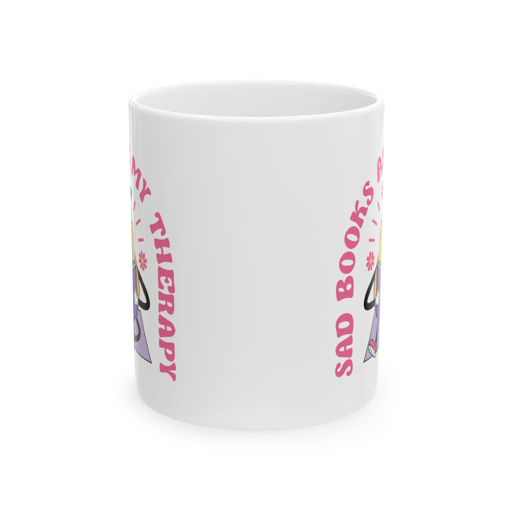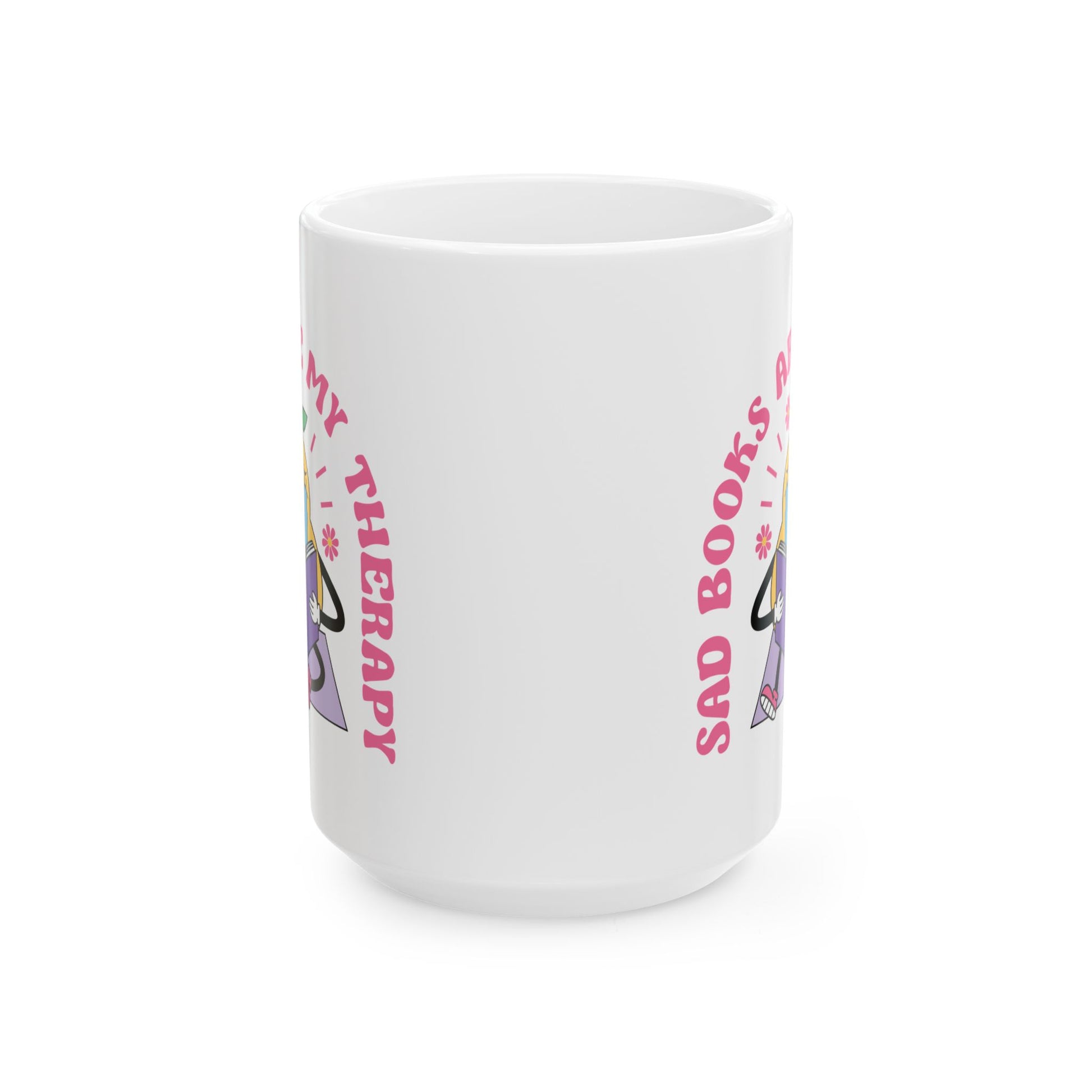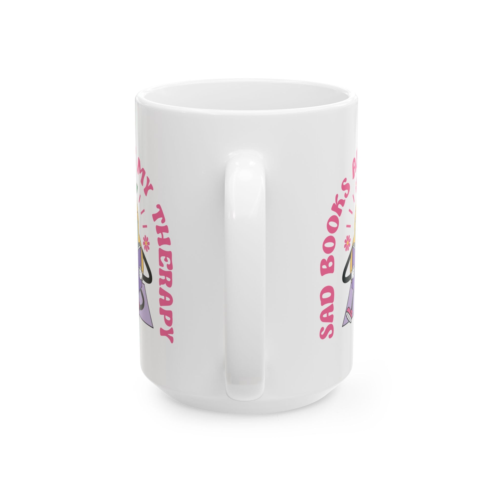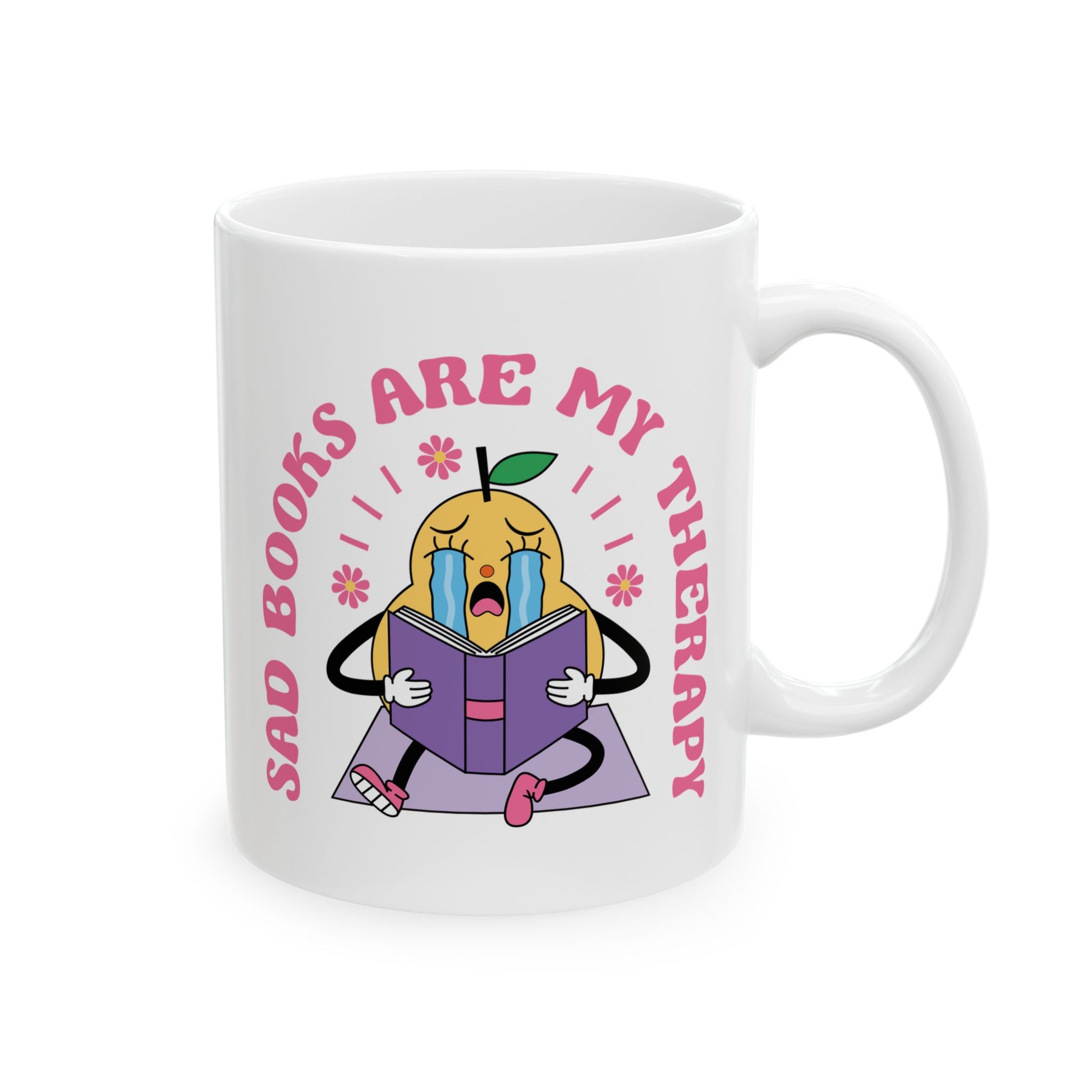 A Sad Books Are My Therapy Mug perfect for book lovers who find solace in reading. With its glossy finish and vibrant colors, this mug is great for enjoying your favorite hot beverages. It is microwave and dishwasher safe, available in two sizes (11oz and 15oz) and made with durable white ceramic for long-lasting prints. Perfect for cozy nights in with a good book or as a gift for the bookworm in your life. Ideal for birthdays, holidays, or any occasion when you need some comfort and relaxation.