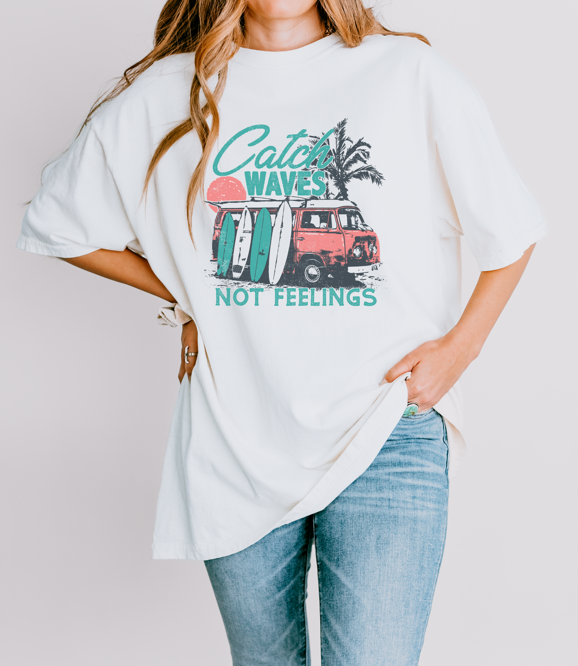 Retro-inspired unisex garment-dyed T-shirt with a 'Catch waves not feelings' design, perfect for coastal cowgirls and fans of Outer Banks. This shirt gives off a laid-back and beachy vibe, ideal for casual outings or as a statement piece. Great for summer or beach-themed celebrations.